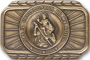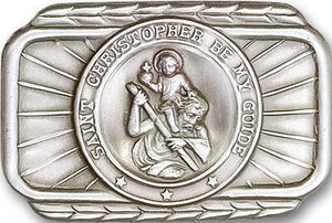 Gold Finish Saint Christopher Visor Clip. The visor clip is a Gold Finish Saint Christopher. The visor clip measures 1 1/8-inch tall by 1 5/8-inch wide. Saint Christopher is the Patron Saint of Travelers/Motorists.