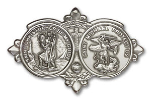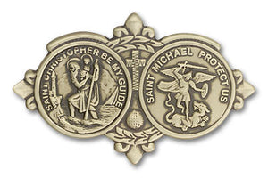 Gold Finish St Christopher St Michael Visor Clip. The visor clip is a Gold Finish Saint Christopher / Saint Michael. The visor clip measures 2-inch tall by 3 1/8-inch wide. Saint Christopher is the Patron Saint of Travelers/Motorists.