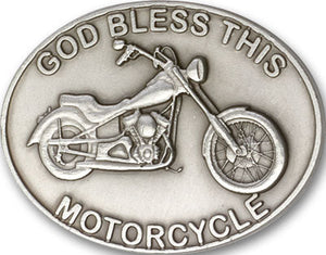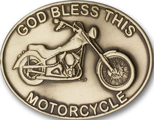 Gold Finish God Bless This Motorcycle Visor Clip. The visor clip is a Gold Finish God Bless This Motorcycle. The visor clip measures 1 1/2-inch tall by 1 7/8-inch wide.