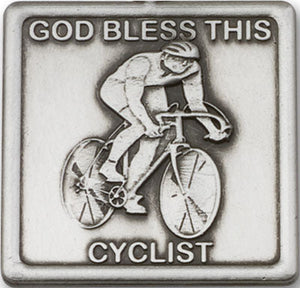 Gold Finish God Bless This Cyclist Visor Clip. The visor clip is a Gold Finish God Bless This Cyclist. The visor clip measures 1 1/4-inch tall by 1 1/4-inch wide.