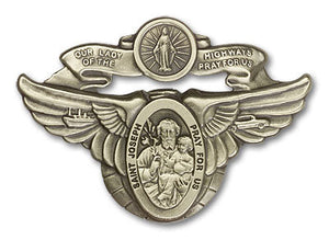 Gold Finish Our Lady of the Highway St Joseph Visor Clip. The visor clip is a Gold Finish Our Lady of the Highway / Saint Joseph. The visor clip measures 2-inch tall by 3-inch wide. Saint Joseph is the Patron Saint of Carpenters/Dying/Fathers.