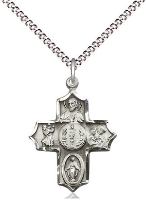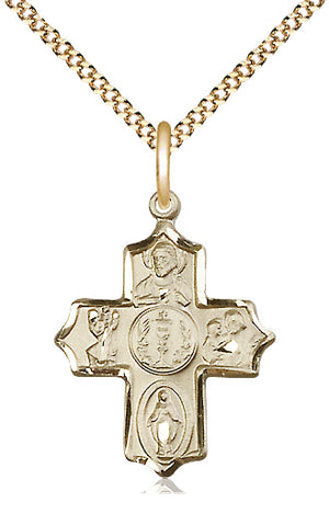 The 5-Way Medal features Scapular on the top, Saint Christopher on the right, Miraculous at the bottom, Saint Joseph on the left and Communion in the center