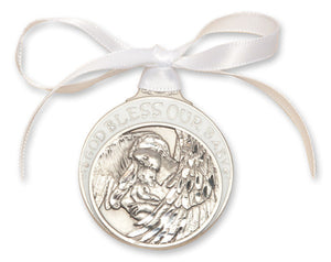 Pewter Baby w/Angel Crib Medal with White Ribbon