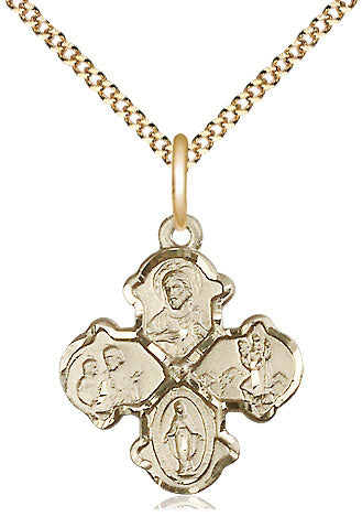 The 4-Way Medal features Scapular on the top, Saint Christopher on the right, Miraculous at the bottom and Saint Joseph on the left
