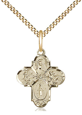 The 4-Way Medal features Scapular on the top, Saint Joseph on the right, Miraculous at the bottom and Saint Christopher on the left