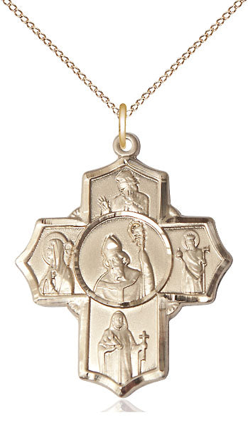The 5-Way Medal features Saint Finnian of Clonard on the top, Saint Bridget of Sweden on the right, Saint Brendan the Navigator at the bottom, Saint Aedan of Ferns on the left and Saint Patrick in the center