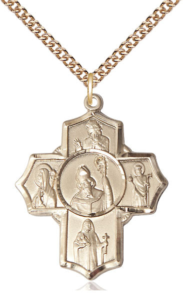 The 5-Way Medal features Saint Finnian of Clonard on the top, Saint Bridget of Sweden on the right, Saint Brendan the Navigator at the bottom, Saint Aedan of Ferns on the left and Saint Patrick in the center