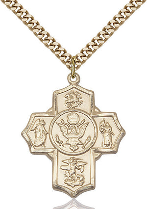 The 5-Way Medal features Saint George on the top, Guardian Angel on the right, Saint Michael the Archangel at the bottom, Saint Joan of Arc on the left and Army in the center