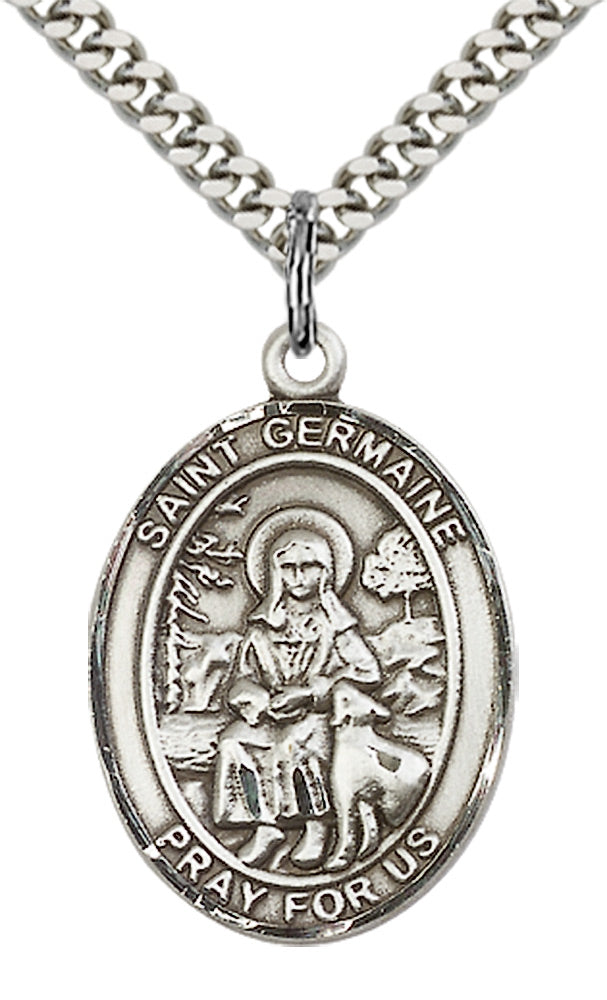 Sterling Silver Saint Germaine Cousin Pendant on an 24-inch Light Rhodium Heavy Curb Chain. Saint Germaine Cousin Medal