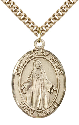 14kt Gold Filled Our Lady of Peace Pendant on an 24-inch Gold Plated Heavy Curb Chain. Our Lady of Peace Medal
