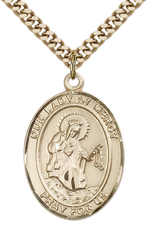 14kt Gold Filled Our Lady of Mercy Pendant on an 24-inch Gold Plated Heavy Curb Chain. Our Lady of Mercy Medal