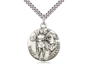 Sterling Silver St Sebastian Pendant on a 24 inch Light Rhodium Heavy Curb Chain.